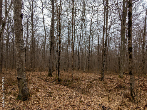 © Vit-Vit, Obraz premium Deciduous forest with fallen yellow foliage covering the ground on a cloudy day.