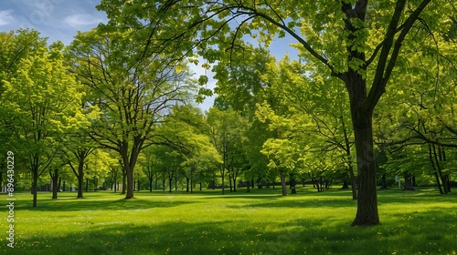 © The Little Hut, Naklejka premium deciduous trees in the park on a sunny day trees growing in the park in spring : Generative AI