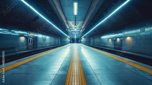 © Artem, Fototapeta premium Declining commuter numbers. A deserted train station platform, illustrating reduction in commuting