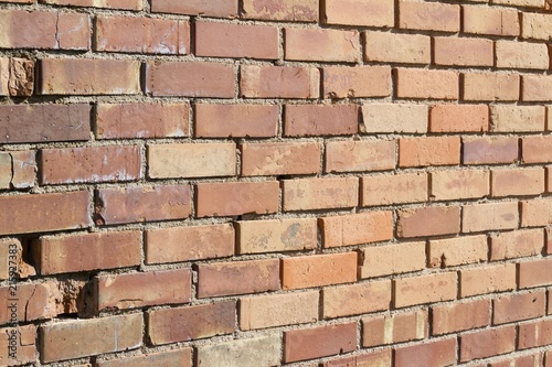 © Cynthia, Obraz premium Decomposing brick wall has interesting old bricks in varying hues of brown and tan