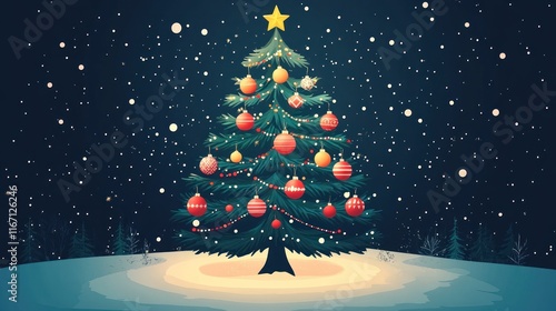 Fototapeta premium Decorated Christmas tree in snowy night scene.