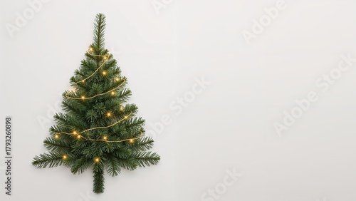 © Lasvu, Fototapeta premium Decorated Christmas tree with lights against a plain wall background.