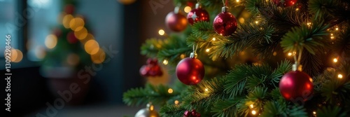 Fototapeta premium Decorated Christmas tree with ornaments and lights, ornaments, wreaths, seasonal