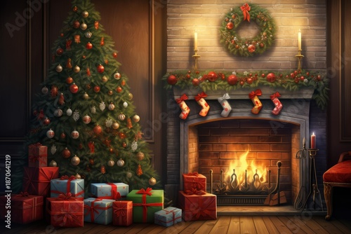 Fototapeta premium Decorated christmas tree with presents next to a brick fireplace and glowing...