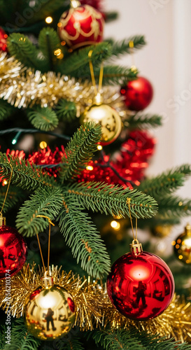 Fototapeta premium Decorated Christmas tree with red and gold ornaments. Festive holiday...
