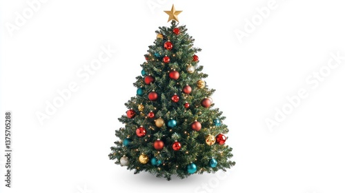 Naklejka premium Decorated Christmas tree with red, gold, and teal ornaments and a gold star.