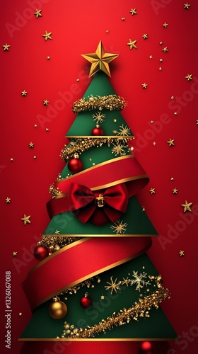 Naklejka premium Decorated Christmas Tree with Red Ribbon and Golden Star on Red