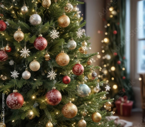 Fototapeta premium Decorated Christmas tree with snowflakes and ornaments, snowflakes,...
