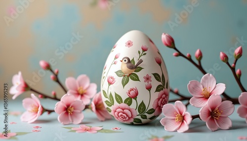 © Janis, Fototapeta premium Decorated Easter egg with floral design on pastel background for spring celebration