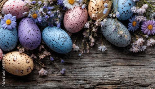 © Fajar, Obraz premium Decorated Easter Eggs and Flowers on Wood