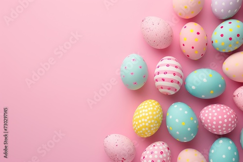© Artistic Images, Fototapeta premium Decorated Easter eggs on pink background, top view. Flat lay composition with empty place for text. Generated AI