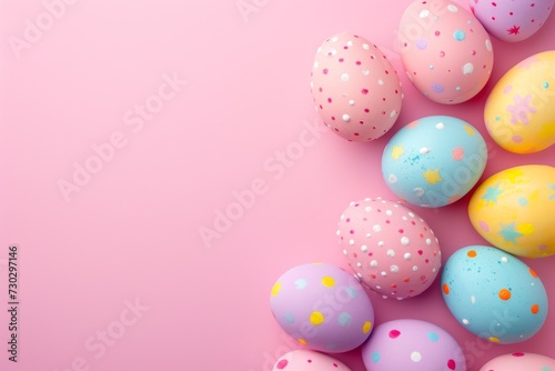 Obraz premium Decorated Easter eggs on pink background, top view. Flat lay composition with empty place for text. Generated AI
