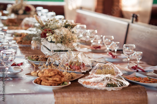 © vadiar, Naklejka premium Decorated elegant wooden wedding table for banquet outdoor in garden gazebo