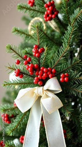 Fototapeta premium Decorated evergreen branch with red berries and white bow tied around a Christmas tree, christmas tree, holiday decoration