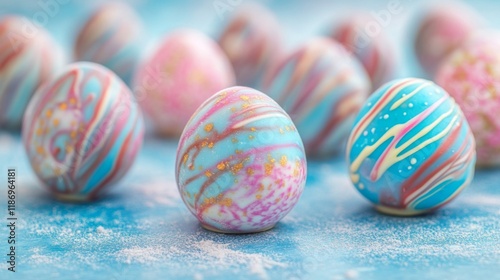 Obraz premium Decorated Pastel Easter Eggs On Blue Surface