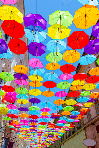 © Roman_23203, Naklejka premium Decoration with hanging umbrellas