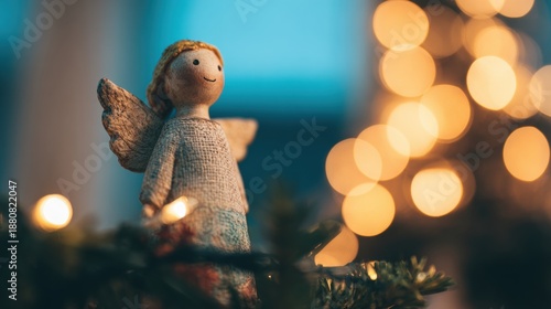 Fototapeta premium Decorative angel figure on a Christmas tree with warm lights in the background