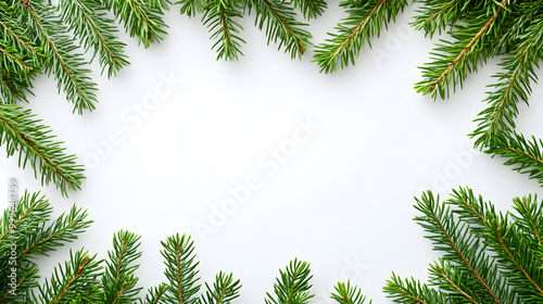 © Oksana_Latysheva, Naklejka premium Decorative border frame with evergreen pine branches isolated on white background with copy space for text