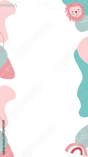 Obraz premium Decorative border framing transparent area showing pastel shapes lion head and rainbow, copy space