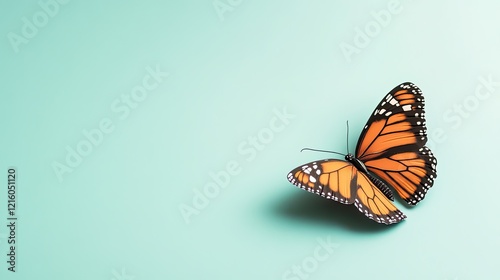 © Maria, Fototapeta premium decorative butterfly ornament resting on matte turquoise background with faint light gradients