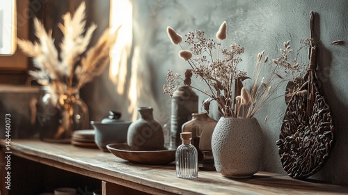© Juan, Fototapeta premium Decorative ceramic vases and dried plants on rustic table