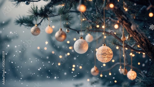 Fototapeta premium Decorative Christmas ornaments and lights hang from pine branches, creating a winter holiday scene.