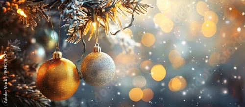 Fototapeta premium Decorative Christmas ornaments in yellow and silver colors hang on a tree branch against a blurred background ideal for a festive copy space image