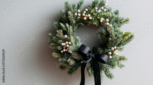 Obraz premium Decorative Christmas wreath made of pine branches with white berries and a black satin bow hanging on a light gray textured wall