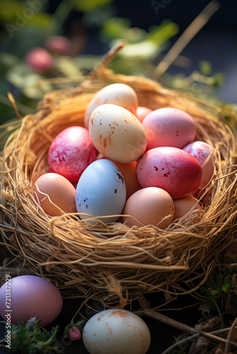 © miro, Fototapeta premium Decorative colorful Easter eggs in nest with copy space