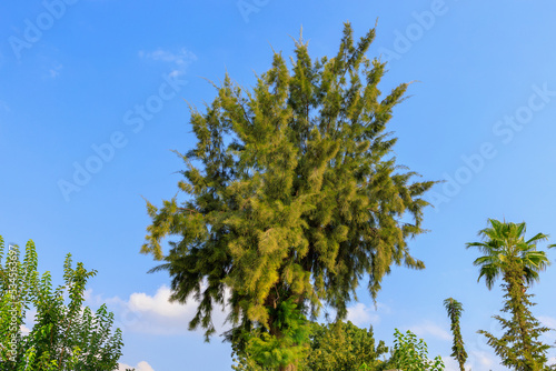Obraz premium Decorative coniferous plant in urban gardening. Background with copy space