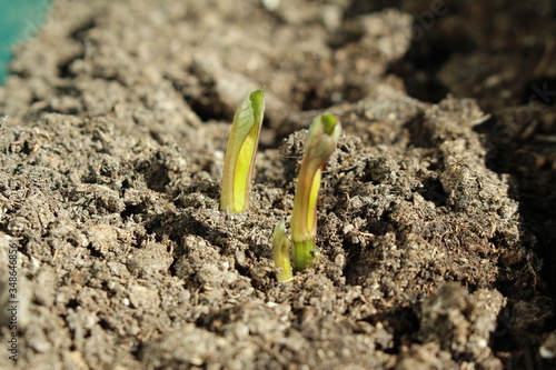 Fototapeta premium Decorative dahlia seeds freshly sprout in the fertilized soil in April