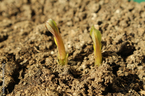Fototapeta premium Decorative dahlia seeds freshly sprout in the fertilized soil in April