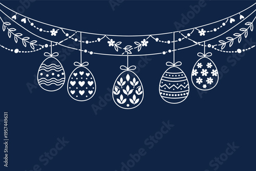 Fototapeta premium Decorative easter eggs hanging on floral garland with navy background