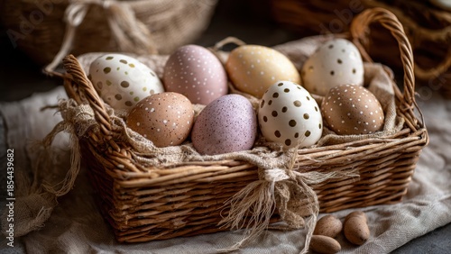 Obraz premium Decorative easter eggs in rustic basket for spring celebration