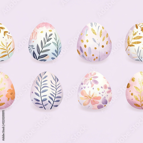 Fototapeta premium Decorative easter eggs with pastel and gold floral patterns on light background