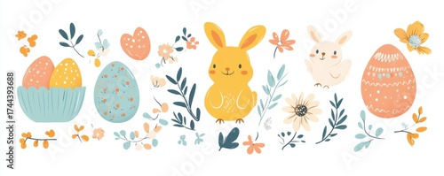 Fototapeta premium Decorative Easter Illustration Featuring Colorful Eggs, Rabbits, and Floral Elements