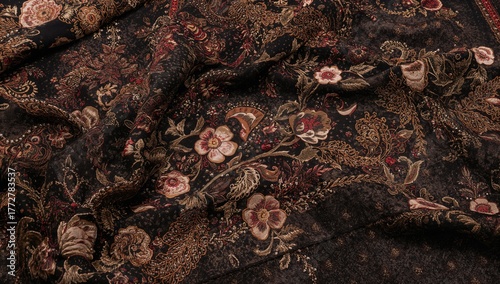 © vxnaghiyev, Naklejka premium Decorative embroidery floral design on dark fabric, suitable for trendy women’s fashion apparel