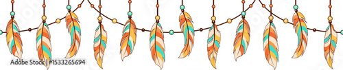 © vectorfusionart, Obraz premium Decorative feather garland is hanging flat style with feathers and beads on transparent background
