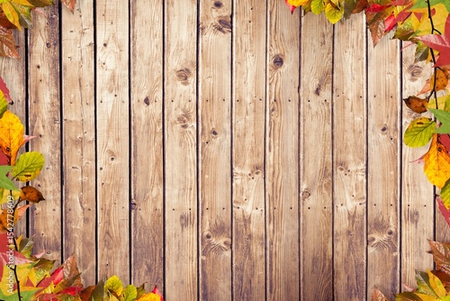 © vectorfusionart, Fototapeta premium Decorative flat design wooden tabletop showing natural grain and knots, with autumn leaves border