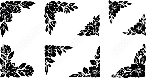 © DesignVectX, Naklejka premium Decorative floral corner elements vector set with black silhouette leaves and flowers