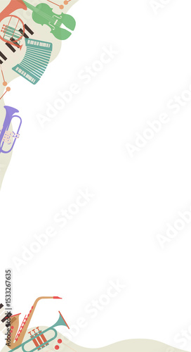 © vectorfusionart, Obraz premium Decorative frame is featuring piano, violin in flat design with clear background, copy space