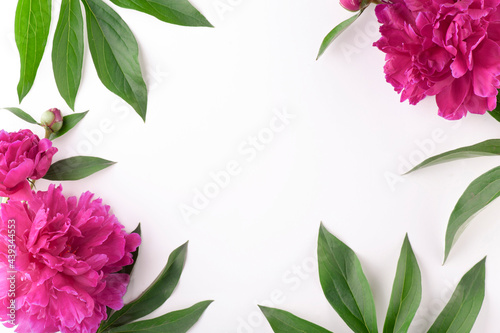 © Gizele, Naklejka premium Decorative frame with dark pink peonies and leaves on white background. Greeting card design template.