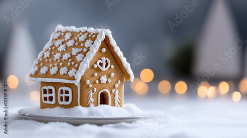 Obraz premium Decorative gingerbread house covered with white icing standing on a snowy surface with warm festive lights in the background.