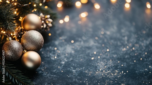 Fototapeta premium Decorative golden ornaments and twinkling lights create a festive atmosphere for the holiday season on a dark surface