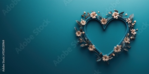 Fototapeta premium Decorative heart-shaped frame adorned with flowers against a teal backdrop