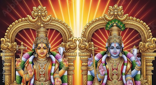 © RAMS, Obraz premium Decorative Hindu Deity Statues with Ornate Gold Crowns and Bright Background