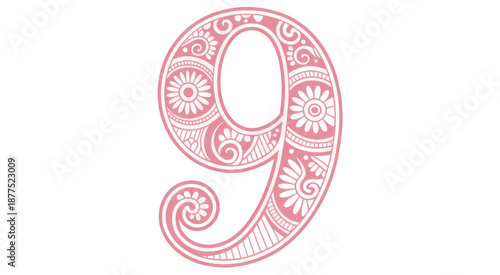 © Anisur, Fototapeta premium Decorative pink number nine with floral patterns decorative number isolated on a transparent background