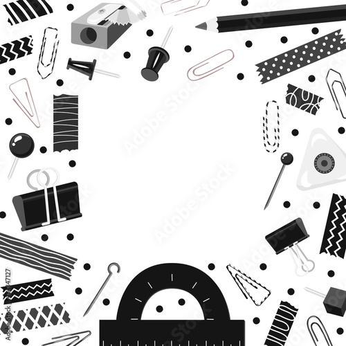 © Larisa Vladimirova, Obraz premium Decorative Rectangular frame with Black and white stationery. Back to school, office work. Space for text. Clip, adhesive tape, pin, needle, eraser, pencil. Vector illustration.