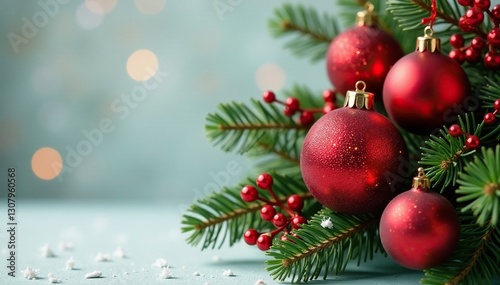 © Thitirat, Fototapeta premium Decorative red Christmas ball wreath on branch, christmas balls, ornaments