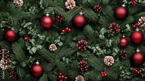 Fototapeta premium Decorative red ornaments and green pine branches create a warm, elegant backdrop perfect for holiday-themed designs and messages